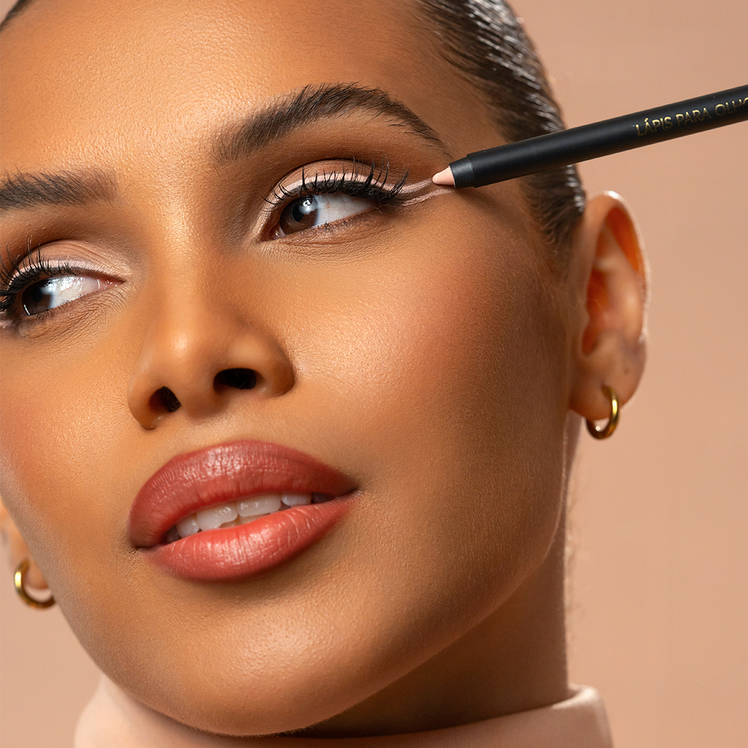 Delineado: deslize o lápis com firmeza e de forma precisa, criando a forma desejada, seja um delineado reto ou em formato gatinho.