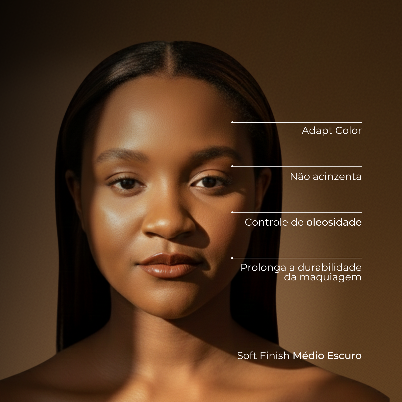 Disponível em quatro tonalidades com tecnologia Adapt Color, ele se ajusta perfeitamente ao tom da pele sem esbranquiçar, inclusive em peles negras.